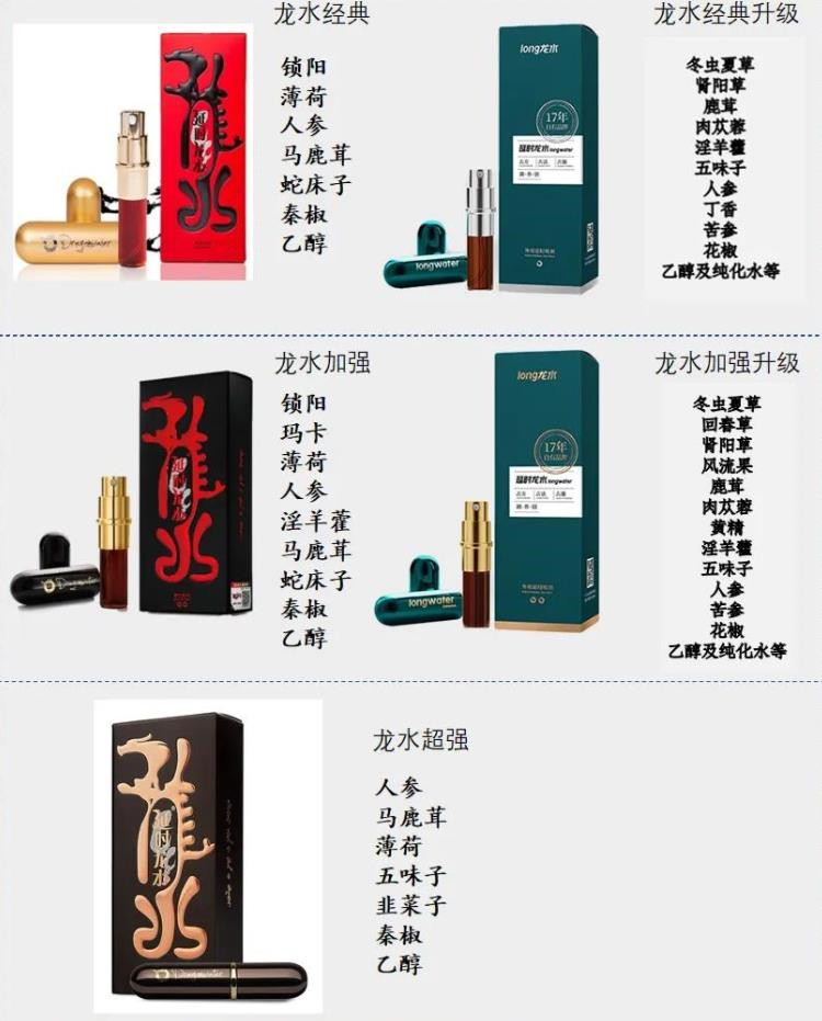 龙水经典:锁阳、薄荷、人参、马鹿茸、蛇床子、秦椒、乙醇;